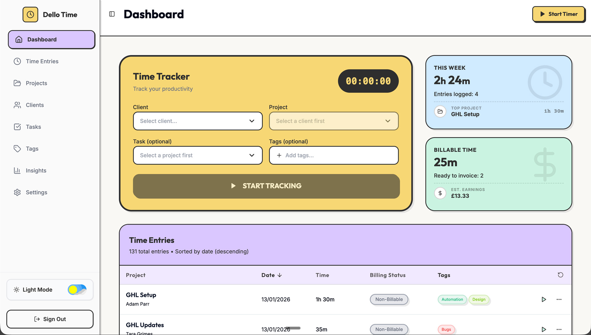 Dello Time is a simple time tracking app for freelancers. Log work in seconds, stay organised with projects and tags, and turn your time into clear, useful insights.